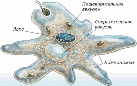 Опорный конспект и задания для закрепления материала Тема: «Гетеротрофные протисты. Амеба обыкновенная» По типу питания протисты разделяются на три большие группы: гетеротрофные, автотрофные и автогетеротрофные. - Вспомните значение каждого способа питания. Амеба обыкновенная. Тело амебы состоит из одной клетки с вязкой густой цитоплазмой и ядром. 1. Цитоплазматическая мембрана (ограничивает внутриклеточное содержимое) 2. Цитоплазма находится в постоянном движении. Если ток цитоплазмы устремляется в одном направлении к поверхности клетки, то в этом месте на теле амебы появляется выпячивание — ложноножка. С помощью ложноножек амеба перемещается по субстрату, т. е. медленно перетекает с одного места на другое, а также захватывает пищевые частицы. Амеба обтекает свою добычу ложноножками со всех сторон, и через какое-то время добыча оказывается внутри амебной клетки — образуется пищеварительная вакуоль, где пища переваривается. Такой способ захвата пищи называется. Фагоцитоз-захватывание и переваривание твердых частиц. 3. Вакуоль. Продукты переваривания из вакуоли поступают в цитоплазму и используются для построения тела амебы и высвобождения энергии. Непереваренные остатки выбрасываются наружу. 4. Сократительная вакуоль. Выделение избытка воды, а вместе с ней и продуктов жизнедеятельности из организма амебы происходит через сократительную вакуоль. Она представляет собой пузырек, постепенно заполняющийся водой с растворенными в ней вредными продуктами жизнедеятельности. Поглощение кислорода и выделение углекислого газа осуществляется у амебы всей поверхностью тела. Неблагоприятные условия (подсыхание водоема, наступление холодов) амеба переносит в состоянии цисты. Заполнение пробелов в тексте. Размножается амеба ____. Вначале делится ____, в котором предварительно ____ количество ____, а затем _____. При обильном питании и благоприятной температуре 20—25 °С амеба делится ______. Выполнение тестовых заданий. 1) Сколько, примерно, видов протистов в природе? А) 50000 б) 10000 в) 4500 2) Амеба обыкновенная по способу питания: А) автотроф б) гетеротроф в) автогетеротроф 3) Фагоцитоз – это переваривание: А) твердых частиц б) жидких частиц в) твердых и жидких частиц 4) Как происходит размножение амебы? А) деление надвое б) спорами в) цистами 5) Циста у протистов для: А) размножения б) перенесения неблагоприятных условий в) питания