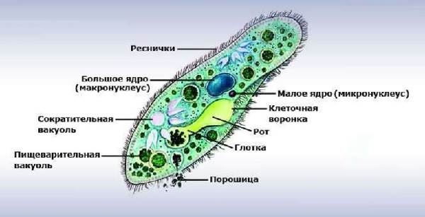 Инфузория туфелька, как и амеба, живет в стоячих водоемах с большим количеством разлагающихся органических веществ. В отличие от амебы инфузория туфелька имеет постоянную форму тела, напоминающую туфельку с тупым передним и заостренным задним концами. Из-за такой формы тела эта инфузория и получила свое название. Вся клетка инфузории туфельки покрыта тонкой и гибкой очень сложно устроенной оболочкой. На поверхности клетки продольными рядами расположено огромное количество ресничек На теле инфузории туфельки имеется углубление, на дне которого находится клеточный рот, который переходит в клеточную глотку. Около рта располагаются специализированные реснички. Они загоняют в глотку вместе с потоком воды основную пищу инфузорий — бактерий. На дне глотки пища попадает в пищеварительную вакуоль, где и переваривается. Газообмен у инфузории туфельки осуществляется через всю поверхность клетки. Продукты обмена также выводятся через поверхность клетки и частично через две сложно устроенные сократительные вакуоли. Основная функция сократительных вакуолей — выведение из клетки излишков воды. У инфузории туфельки имеется два разных по строению и функциям ядра. Большое бобовидное ядро контролирует жизненные процессы в клетке. Малое ядро округлой формы регулирует процесс размножения. Размножение: Бесполое размножение — это поперечное деление клетки надвое. Половой процесс у инфузории туфельки происходит в форме конъюгации. 1. Назовите основные органоиды инфузории туфельки. Укажите особенности ее строения. 2. В каких средах обитания встречаются гетеротрофные протисты? 3. Как происходит размножение инфузории туфельки? 4. Сравните органоиды амебы и инфузории туфельки. Найдите черты сходства и различия. Объясните причины. 5. Какова роль в клетке большого и малого ядер? Какова их роль в процессе размножения? 6. Докажите, что строение амебы и инфузории туфельки соответствует общим чертам организации всех ядерных клеток.