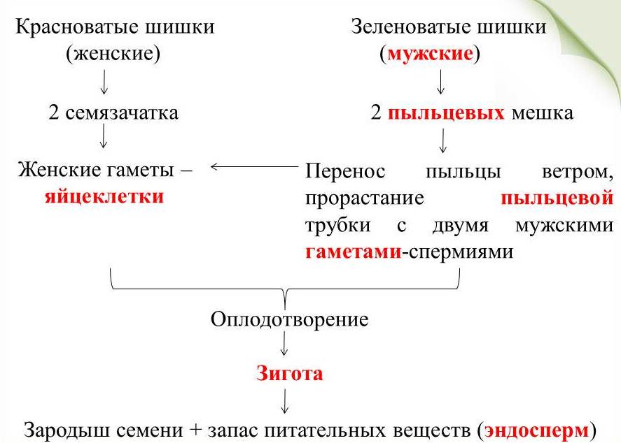 Размножение – это увеличение числа особей Если внимательно рассмотреть весной ветку сосны обыкновенной, на ней можно обнаружить разные шишки. У основания молодых веточек расположены мужские, а на верхушках веточек — красноватые женские шишки. Мужские шишки мелкие, зеленовато-желтые, собраны группами. Каждая шишка представлена осью, к которой прикреплены чешуи. На нижней стороне каждой чешуи мужской шишки находятся по два спорангия, как у мхов и папоротников. Там образуются споры, которые, не покидая спорангия, прорастают внутри него. Поэтому развитие спор не зависит от наличия воды. Каждая спора покрывается плотной оболочкой, ее содержимое делится. В результате образуются пыльцевые зерна (пыльца). Поэтому спорангии мужской шишки называют пыльцевыми мешками. Женские шишки, как и мужские, состоят из оси и прикрепленных к ней чешуй. На верхней стороне у основания чешуи лежат два семязачатка. В семязачатках образуются женские органы полового размножения; в них созревают яйцеклетки. Пыльцевое зерно: 1. Вегетативная клетка – образует пыльцевую трубку. 2. Генеративная клетка – образует 2 спермия. Процесс переноса пыльцы с мужских шишек на женские называется опылением.