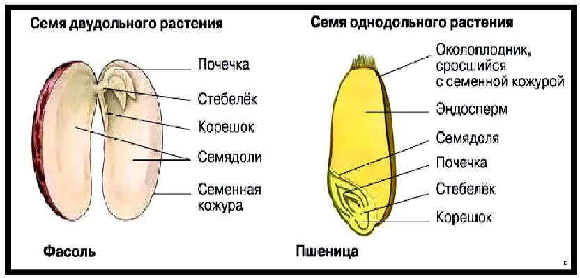 Опорный конспект и задания для закрепления материала Тема: «Строение семян» Семя состоит из зародыша, запаса питательных веществ и семенной кожуры. Зародыш — это зачаток нового организма, который образуется из зиготы. Зародыш состоит из зародышевого корешка, зародышевого стебелька, который заканчивается зародышевой почечкой. Семядоли — это первые листья зародыша. Запасные питательные вещества могут откладываться в особой питательной ткани (эндосперме) или в семядолях зародыша Семенная кожура (защитная функция) образуется из покровов семяпочки. Зародыш может иметь одну семядолю или две. В зависимости от количества семядолей растения делятся на однодольные (кукуруза, лук, овес, пшеница, рожь, тюльпан) и двудольные (горох, огурец, тыква, фасоль). У однодольных растений единственная семядоля называется щиток.